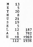 * From each side at the top see Nov., 2, 1938! Methuselah, being the oldest man ever to live, implies great wisdom in Hermetic coding. His story is found in Genesis, Chapter 5. His story and the value of his name are demonstrated here:
